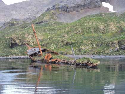 In 1911, a whaling station was set up here, but for the first few years all the processing of whale carcasses took place on a steam-powered factory ship called Restitution that was moored in the bay each summer. This lasted until she was wrecked in the Isles of Scilly off Cornwall, England, in 1916. After that, a slipway was constructed and all whale processing took place on land, similar to what we saw at Grytviken a couple days ago. An old three-masted bark called Brutus (built in Glasgow in 1883) was purchased for use as a coaling ship after she was retired from the South American nitrate trade. She remains there today as a wrecked hulk near the ruins of the whaling station.