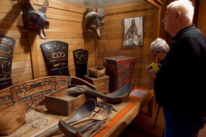 Once the ship was tied up in the Cow Marina, there was a very short wait for Canadian Customs officials. Soon our vessel was cleared and we were all free to disembark for morning activities. Half of our group went for a short natural history walk along a local creek, while the other half went to the Museum of Northern British Columbia. The architecture of this museum is the first striking view as our group made their way a short distance from the dock into the small city of Prince Rupert. Built in the early 1980’s the idea at the time was to create a museum that would exemplify the First Nation’s style of Long House.