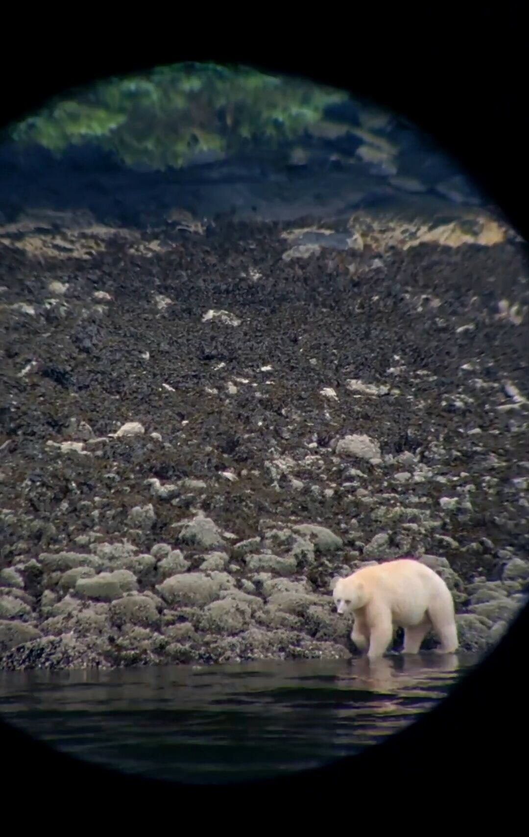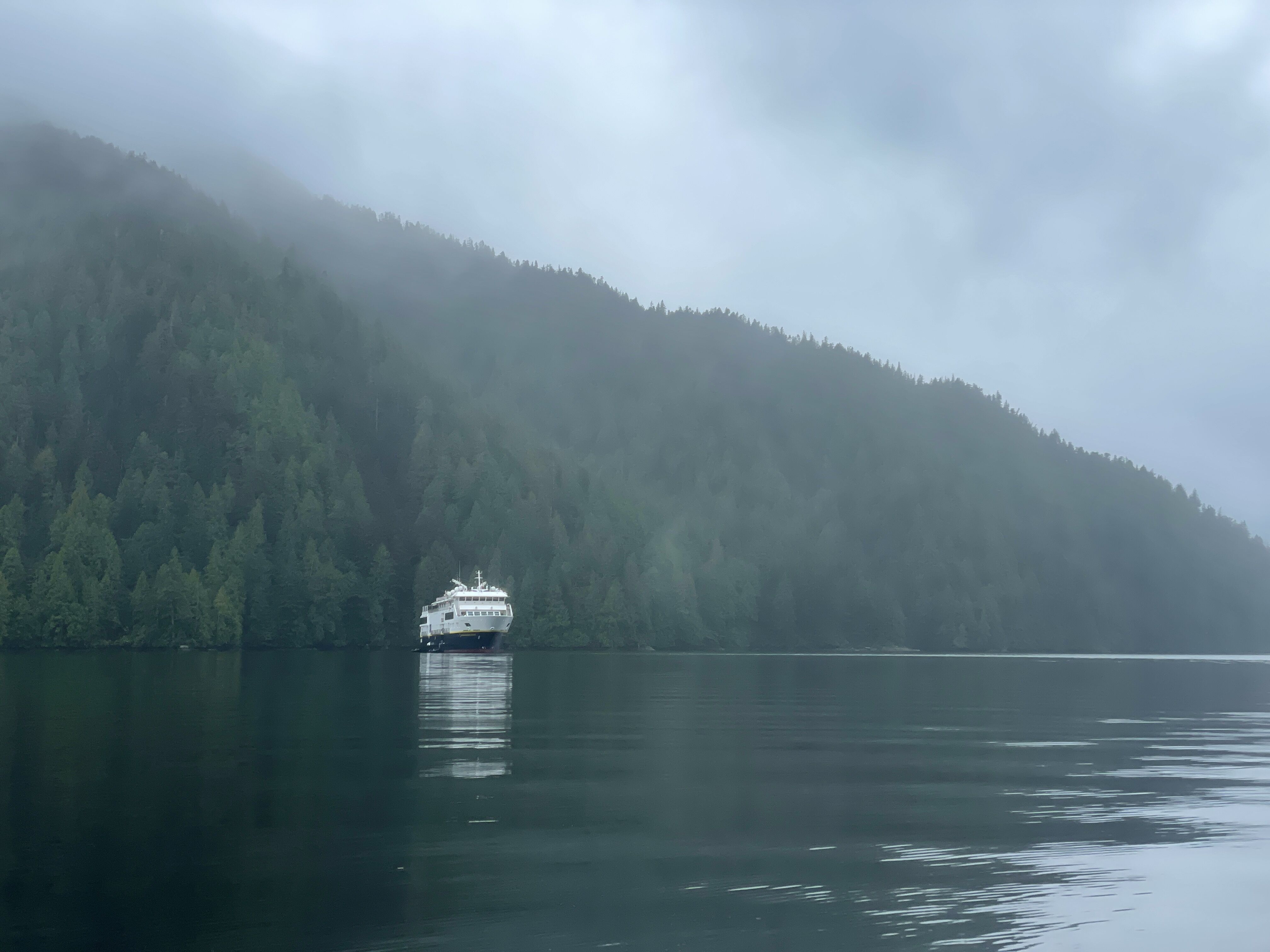 The early morning started off with dense fog obscuring the coastline, but as the sun continued to rise, the fog burned off and the conditions changed to an overcast sky and a slight drizzle. The coastline became clear and with a low tide, we suddenly had the perfect conditions for spotting wildlife. The past couple of days have already offered us wonderful wildlife viewing opportunities, including orcas chasing a Dall’s porpoise, spouting humpbacks, and a sighting of a spirit bear, also known as a white Kermode bear. Everyone was blown away by seeing one spirit bear, and it never crossed our minds that we might have the extraordinary luck to see a spirit bear twice! And yet, as we cruised along Princess Royal Island, a waterfall came into view, providing a perfect opportunity for a potential bear. Naturalist Jesse Humbert was on the spotting scope, prepared to spot another spirit bear! Two black Kermode bears were also quickly spotted, adding to the magical moment.