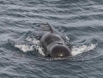 Plentiful in numbers and practically surrounding the ship, they were very active and probably feeding on their main stable diet of squid, providing great opportunities for various photos and video opts. Their color pattern is fairly simple-basic black or dark brown, with a light gray throat patch and often a conspicuous light gray saddle behind the dorsal fin. The bulbous head has given them the nickname of pot-head, which will protrude beyond the front of the mouth, with a short, barely noticeable beak. We hung with them for over an hour, continued on our way, only to have long-beaked common dolphins surround our vessel and do a bit of bow riding before continuing on their way. The rest of our morning was a hands-on camera time with photo instructor Rikki Swenson, learning photo essentials with various cameras to hopefully optimize the use of them for the rest of our journey.