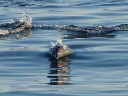 A disturbance in the distance broke the surface calm. It approached us until we could see dark forms breaking through the surface and then returning to the water below. We had encountered a large group of long-beaked common dolphins. It is so difficult to estimate group size, since we see them only in their brief airborne moments. Surely, they numbered in the hundreds. (Digression: what is the appropriate collective term for dolphins? ... a school? ... a pod? ... a herd? This writer prefers "buncha," as in "a whole buncha dolphins"; but that one was a hard sell.) Cameras clicked, and cries of glee sounded when the dolphins joined us to ride the bow wave or the wake from the stern of the National Geographic Sea Bird; or when several dolphins leaped in apparent synchrony; or when a mother and her small dolphin baby were seen swimming in tandem. In reviewing my photos of the event, I am most struck by the reflections and the texture of the water. What a wonderful beginning to our day in the Gulf of California.