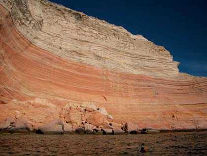 At daybreak we were cruising north in the Sea of Cortez along the east shore of Isla San Jose. Our destination was Punta Colorado, a stunning point with peach-colored cliffs, beige rocks, and turquoise water. Erosion has slowly smoothed the uplifted seabed of this cove into elegant, curving landforms. During our walks ashore, we found countless shells, and a 2.5-million-year-old whale vertebra. Hikers explored the arroyo, while snorkelers swam beneath pink cliffs and discovered colorful schools of blue and gold snappers and wrasses.