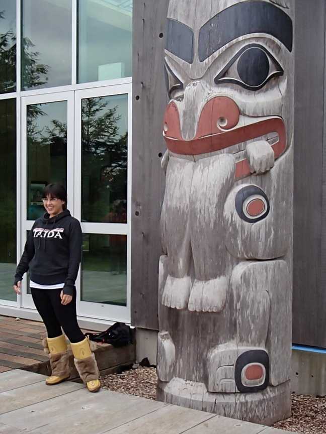 We pulled up to the docks of Queen Charlotte City this morning under high clouds and no wind.  At breakfast, we met our local cultural interpreter, Elsie Stewart-Burton, and our local logistics coordinator, Sue Perin, who will both be joining us during our time on Haida Gwaii.  They accompanied us on the short bus journey to the Haida Heritage Centre, where we were fortunate to have two remarkable, young Haida guides, Raven and Alex.  Raven interpreted the totem poles in- and outside the beautiful building and told us some very entertaining Haida legends.  Alex and Elsie shared information about the process of weaving and the ceremonial uses of today’s button blankets.  I was very moved by Alex’s story of being presented with her blanket by six of her aunties at her high school graduation ceremony and how that meant more to her than the cap and gown.