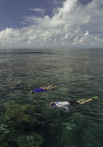 Our morning began with a delicious plunge into the sea from the anchored platform, swimming or snorkeling along the edge of the reef.  Once again it was a world-class experience.  An amazing variety of corals were crowded the shallows of the reef top and continued down to the sand about 40 feet below, a riot of wonderful shapes and rich colors glowing in the brilliant ripples of sunlight.  All around, above, below and within, were bouquets of beautiful fish.  “There’s an ornate butterfly fish, and a rabbit fish, and bunch of bright purple anthias!” …On and on as we swam from one spot to another.  Best of all we found a small coral tower festooned with anemones and five different species of anemonefish living together in a little palace of diversity.