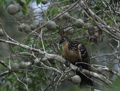 Our afternoon outing was up the Rio Dorado, and our plan was to stay out past sunset and experience the rotation from daytime inhabitants and their associated symphony, to the nighttime denizens and their accompanying cacophony. Horned screamers were sighted and their pulsing, donkey–like brays echoed through the forest. The rasping, cough-like sound of a group of hoatzins caught our attention. It takes a fine-tuned ear, as our local naturalists have developed, to recognize the species of bird you are looking for by the sounds surrounding you. In addition to the various bird species, a group of monk saki monkeys were found, as well as a small group of squirrel monkeys climbing high into a tree to rest for the night.