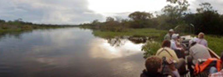 For the second half of our day we took to the skiffs once more, this time going up the Río Dorado. The varzea or flooded forest gave us endless opportunities for exploration. A white-eared jacamar with an impossibly long and thick bill sat patiently in a cecropia tree. More sloths were found, one sprawled and basking, appearing to enjoy the late afternoon sun shining on its belly. More macaws flew about and as the light faded, a serenade by horned screamers echoed through the forest. Other chirps, creaks, honks, and peeps started as the nighttime troubadours proceeded to warm up and replace the daytime chorus.
