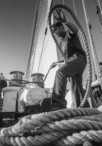Captain Pushkarev called the crew to sail stations at 0900, and 18 sailors scurried aloft into the rigging and out onto the yardarms to untie the gaskets and prepare the sails for setting. The extensive rigging of a tall ship means that a strong beam wind will push most of the ship to leeward and tend the bow up into the wind, so Captain Pushkarev started by setting the headsails to keep the bow in line. The square sails were then set in order, beginning with the lower topsails, and once the upper topsails were set the engines were cut, the course altered to south, and we were sailing! We set almost all the square sails, knowing that we would have to shorten sail as the day went on, and sure enough the sailors had to hustle aloft again and again to progressively take in the upper sails as the day progressed. It was fantastic to watch all the sail activity, and nothing could have prepared us for the complexity of activity and action involved in true square-rigger sailing.