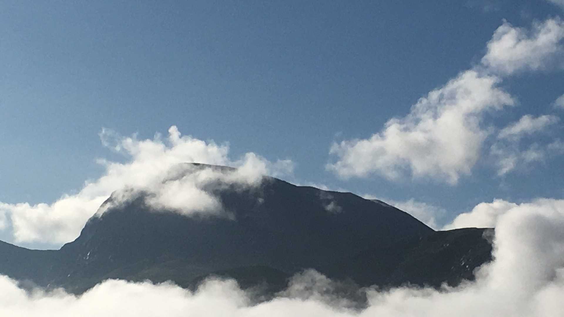 The mist soon cleared, leaving intriguing wisps of clouds around the base of the mountains. And from then on we had a day of pure sunshine. The reflections of the heather-covered hills in the canal were out of this world.