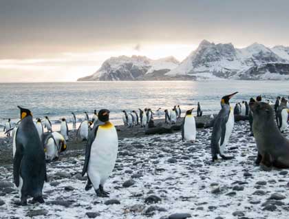 Our second full day in South Georgia began before daybreak in this magnificent and wild place.  The National Geographic Explorer had anchored overnight in a nearby sheltered bay and set sail for Salisbury Plain at 0315 with the intention to begin our outing just before 0500.  Salisbury Plain is known mainly for being the site of the second largest King Penguin colony in South Georgia.  The breeding population is estimated to be between 60-100,000 pairs of King penguin.  The range in that estimate varies due to the fact that King penguins have a unique breeding system in that the birds nest on a triennial cycle, that is 1-2 nesting cycles in 3 years.   On average a pair of Kings will take 12-14 months to raise their one chick to fledgling age.  It's this fact that means all the King penguin colonies are occupied and active at all times of the year with some birds incubating their one precious egg, others tending to newly hatched young, and still other birds tending to the large downy brown chicks called “Oakum Boys”.   By 0430 the expedition team was on shore and readying for the guests that chose to get a predawn glimpse of this bustling and wild locale.  Along with the sights and sounds of tens of thousands of King penguins, the beach and breakwater of the shoreline is literally crawling with young Antarctic Fur seal pups whiling away the day awaiting their mothers return from foraging to nurse them.  These big-eyed pups make no attempt to hide themselves from our presence.  Instead rather, they approach with bravado and flare scampering up to within just feet, all the while making the most raucous sounds and calls.  As the day broke through the cloud cover the whole scene began to unfold and if one were just simply to sit still at any point one would be soon surrounded by 3 foot tall penguins being curiously examined while small herds of adorable seal pups get a closer look.  We were able to stay at this remarkable place the entire morning and we left the sounds and sites reluctantly for our next destination of the day.