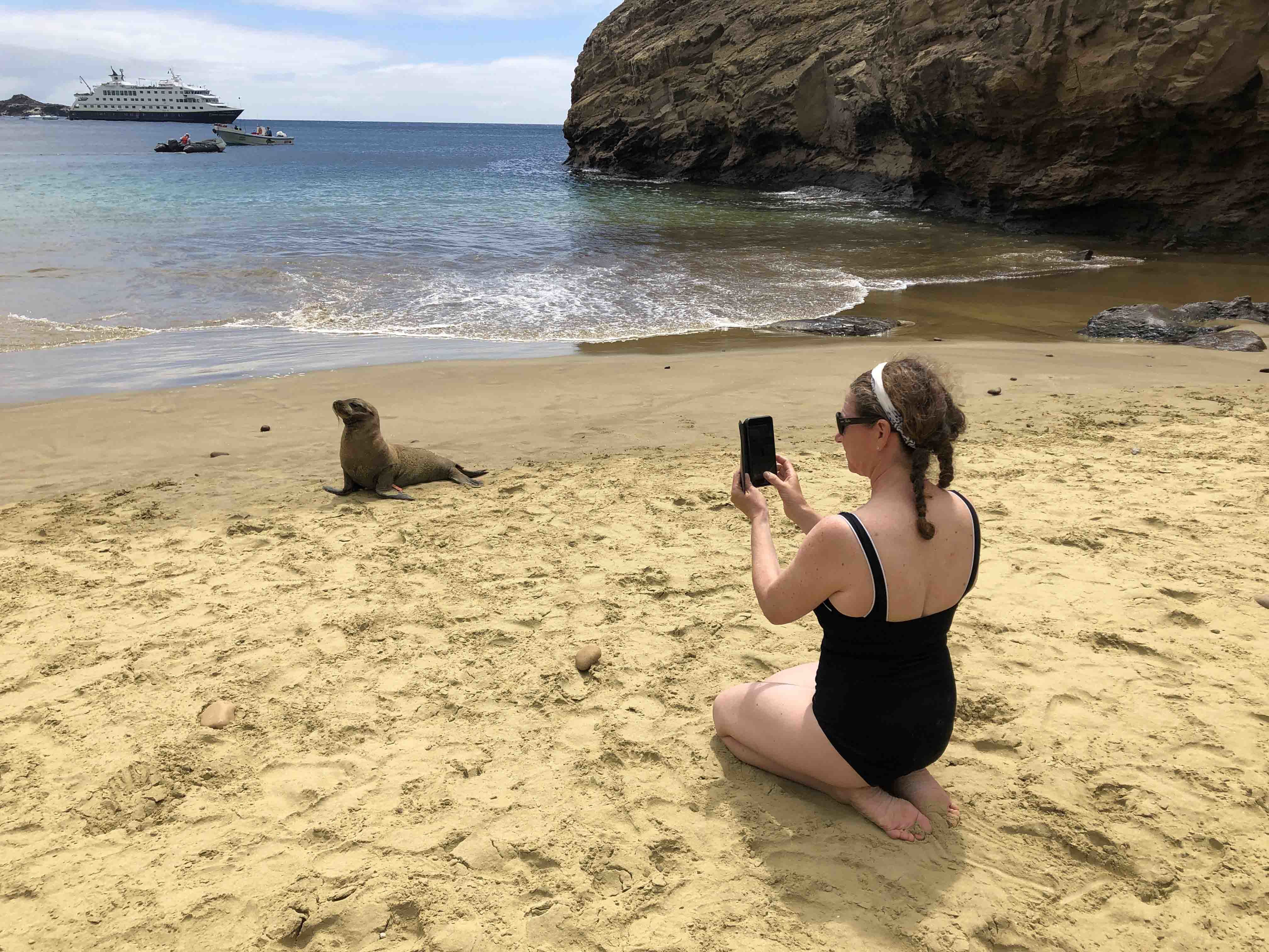 By the time we awoke, the sun was shining and the sky was blue with fluffy clouds, ideal conditions for our 7:45 a.m. hike up to the northernmost volcano of the very point of this island, known as Punta Pitt. The landscape was amazing, due to the shape of the volcano’s sharp points, the colors a blend of browns and oranges were just spectacular. Along the way, we found some blue-footed boobies with their chicks, we saw frigatebirds flying, and what we considered the highlight of this place, the red-footed boobies sitting on their nests, some already with chicks.