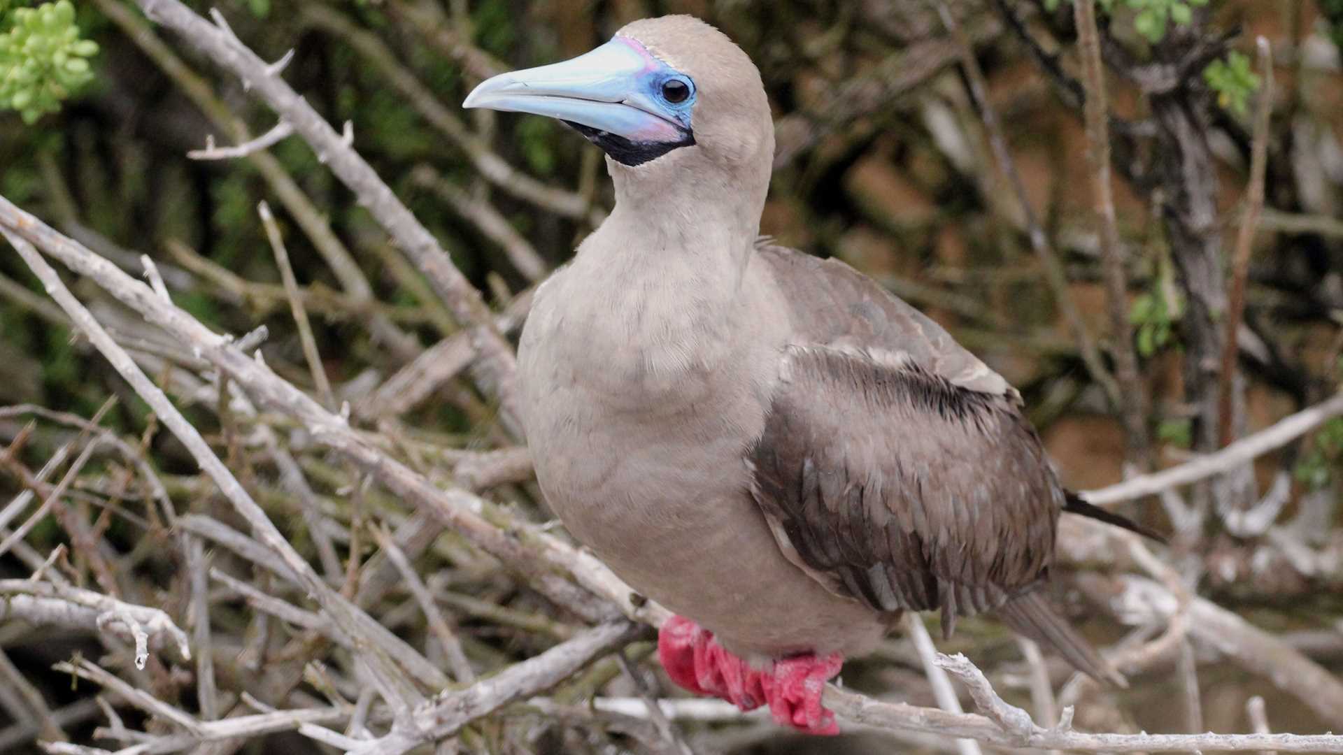 From the top, the view was spectacular. The flat terrain made our hike easier. Some blue-footed boobies use the area for nesting; we observed several of them incubating their eggs. In bushes and trees, red-footed boobies did the same. They have a brown or white plumage and a blue bill. Their fluffy chicks were the delight of our guests. In the distance and closer to the ocean, Nazca boobies nested on the ground or on flat rocks, leaving their white guano everywhere. In the air, frigatebirds and blue-footed boobies glided like kites as they looked for fish in the immense ocean.