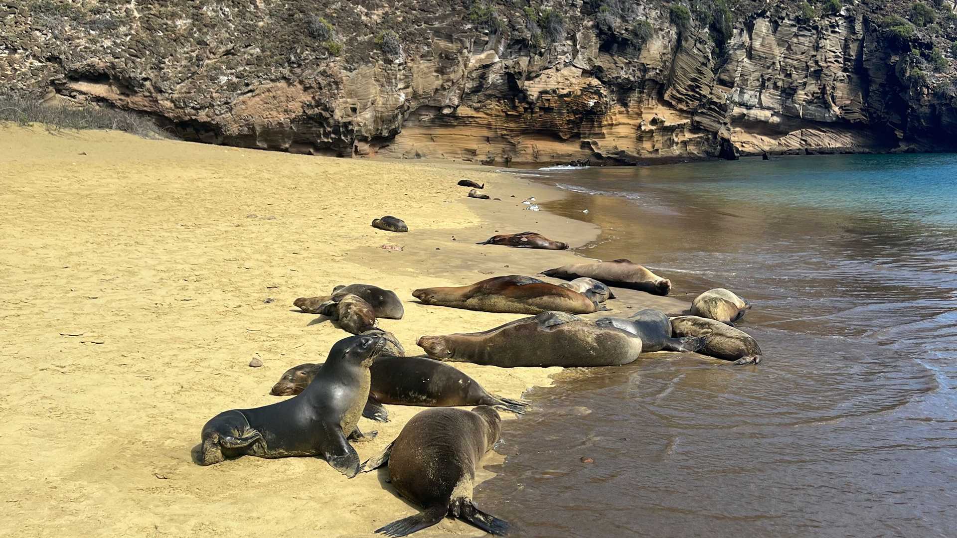 Photo caption and photographer: Galapagos sea lions rest on the beach at Punta Pitt. The Galapagos sea lion shares an ancestral species with the California sea lion. San Cristobal Island is home to the largest population of Galapagos sea lions in the archipelago. Photo by Alexandra Widman
