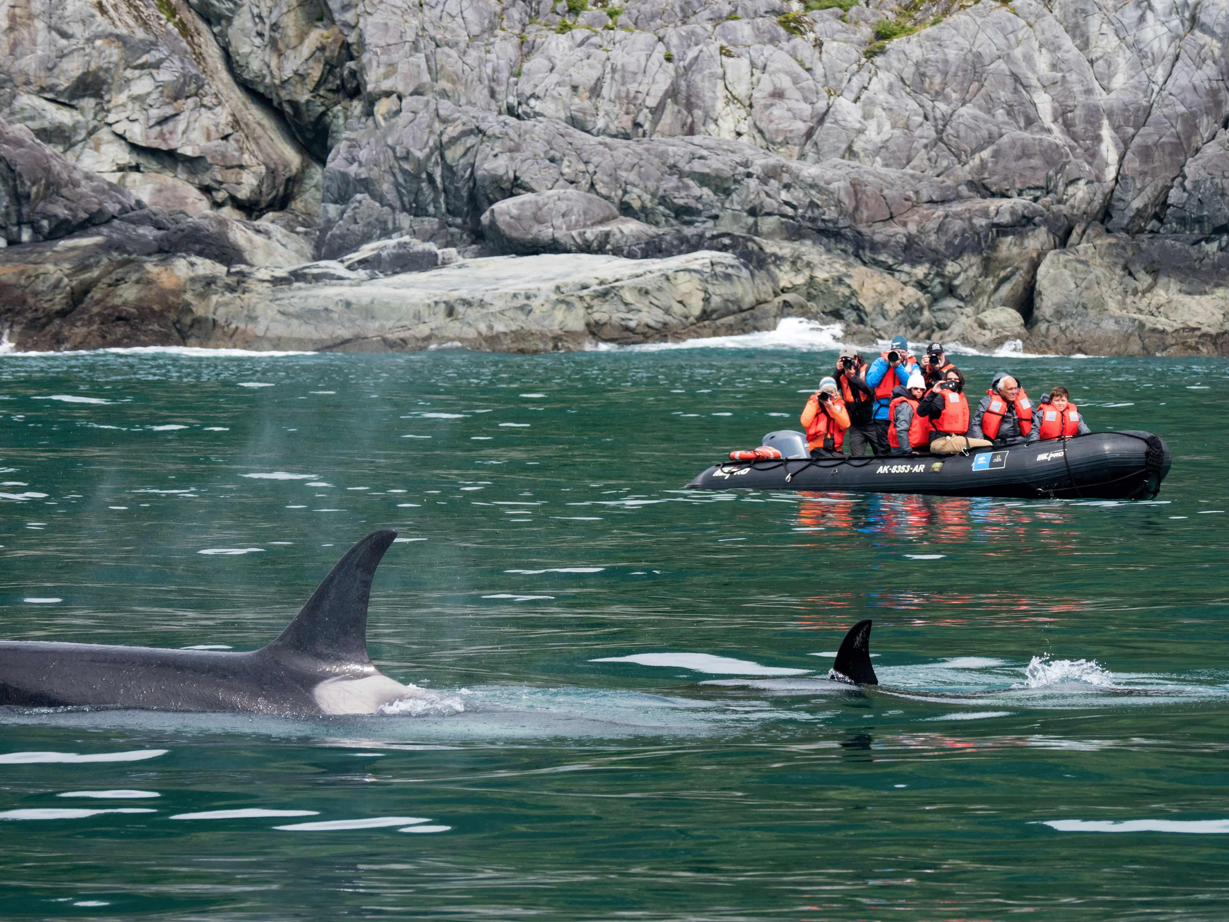 Today, we opted for a fun Zodiac ride to search for red-footed boobies. Soon after, we landed on a green olivine beach for a 1.5-mile walk. The volcanic scenery was spectacular. The peaks of tuff high in the sky made this site unique. We saw many red-footed and blue-footed boobies. Chicks, juvenile, and adults feeding and taking care of their young. Back on the beach, we had fun swimming and playing with a small colony of sea lions, our ever-present friends. We rounded off our last full day in the islands by visiting Cerro Brujo for a beach walk.