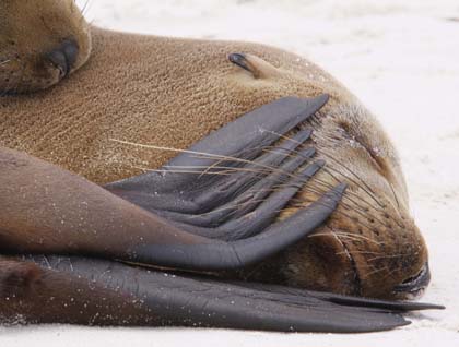 Magnificent and great frigates also nest on the vegetation, and it is quite odd to see them perching so close to other birds species; after all, frigates are known to be the pirates of the air and often steal the fish caught by other seabirds. The end part of the trail is quite stunning with the colorful Sesuvium or Galápagos carpetweed; Nazca boobies seemed to fly in large flocks close to the rocky shores, with the vast blue-grey ocean as a background. We returned back to the landing beach along the canyon formed by torrents of water throughout hundreds of rainy seasons; then, there was time to relax at the beach where some Galápagos sea lions slept. The waters of this little bay were constantly patrolled by its ‘owner,’ a young male sea lion; that was, until we realized that the real master of the bay, who seemed to have been briefly away, chased the young ‘impostor’! The sun shone through the passing clouds making the tiny crystals of olivine sparkle in the sand and the sea turned blue. The colors were magnificent but we had to return to the ship to continue with our navigation further south along San Cristobal Island.