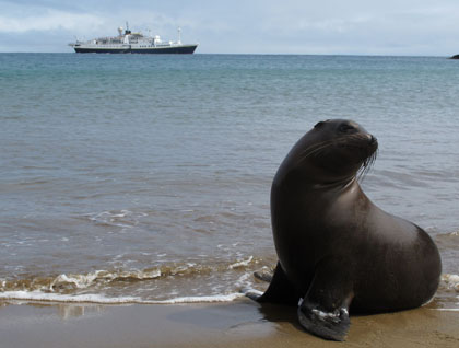 Before returning on board however, there was an opportunity to spend time on the landing beach; a very soft sand beach, green-tinged with olivine crystals and some young, playful sea lions. By the time folk were ready to go swimming, the cool mist from the inversion layer had burned off and the sun was bright. Some of us spent our time practicing a week’s-worth of photography tips, or searching (with success) for two more endemic species found only on San Cristobal Island: the lava lizard and mockingbird. Surely Darwin marveled at them as well on his first visit on shore in 1835! But in the end, everyone, and I mean everyone, was drawn to the water. Four young sea lions around six months to one year of age had decided that the humans were the most fascinating things they had seen in ages (and of course we thought the same, but vice versa). Many people got into the water for the experience of having these sleek creatures dive around them, jump around them and splash around them. The rest recorded the event for prosperity…and what a hoot it was for all! It was only with great reluctance that we finally left the golden beach of Punta Pitt to board once more our home-away-from-home. We had yet one more adventure…