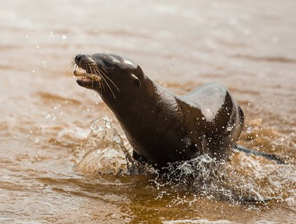 On the beach we were welcomed by marine iguanas basking in the equatorial sunshine. The beach was also packed with sea lions and pups playing in the surf. Eager hikers took a path made by erosion during the rainy season to reach the red-footed booby colony on the northwestern side on San Cristobal. The long walk was worth it. The scenery was colorful due to the changing leaves of the sesuvium, which made for a beautiful nesting area for red-footed boobies as well as Nazca boobies. Back on the olivine beach, we snorkeled and swam, finding ourselves surrounded by playful juvenile Galapagos sea lions and blue-footed boobies fishing close to shore.