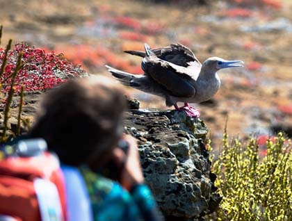 Punta Pitt also has impressive scenery from up above, and here we can see red-footed boobies. All our senses become aware as we listen to our surroundings. Soon after, we have some beach time and our young explorers have their Zodiac driving lessons.