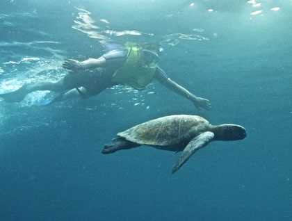 The National Geographic Islander traveled the north coast in a southerly direction until we came into view of the renowned “Kicker Rock”, or in Spanish, “Leon Dormido”.  It is also a tuff cone and also eroded badly from the centuries.  It lies in a dramatic location off shore surrounded by deep, deep water. The intrepid gathered their gear and dared to get into the Zodiacs for a last deep-water adventure snorkel.