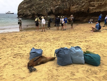 Today we opted for a fun and short Zodiac-ride in search of the red-footed boobies, and soon after we landed on a green olivine beach for a 1.5 mile walk, where we had close encounters with red-footed and blue-footed boobies, and this time we saw some young chicks as well as adults. The volcanic scenery that we observed during our intense hike was spectacular; the peaks of tuff high in the sky make this site very different from what we have already witnessed. Back on the beach, we had fun swimming and playing with a small colony of sea lions, our ever-present friends. One of the sea lions took over our pile of towels. Some of our guests took group photos and family photos, as a farewell to this wonderful week.