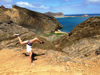 Today we opted for a fun Zodiac ride, searching for red-footed boobies and soon after, we landed on a green olivine beach for a 1.5 mile walk. The volcanic scenery that we observed during our hike was spectacular, and one of our young guests celebrated our excellent outing by doing handstands! The peaks of tuff high in the sky make this site very different from what we have already witnessed. Back on the beach, we had fun swimming and a couple of sea lions joined us, our ever-present friends. Some of us took pictures on the beach as well, as a farewell to this wonderful week.