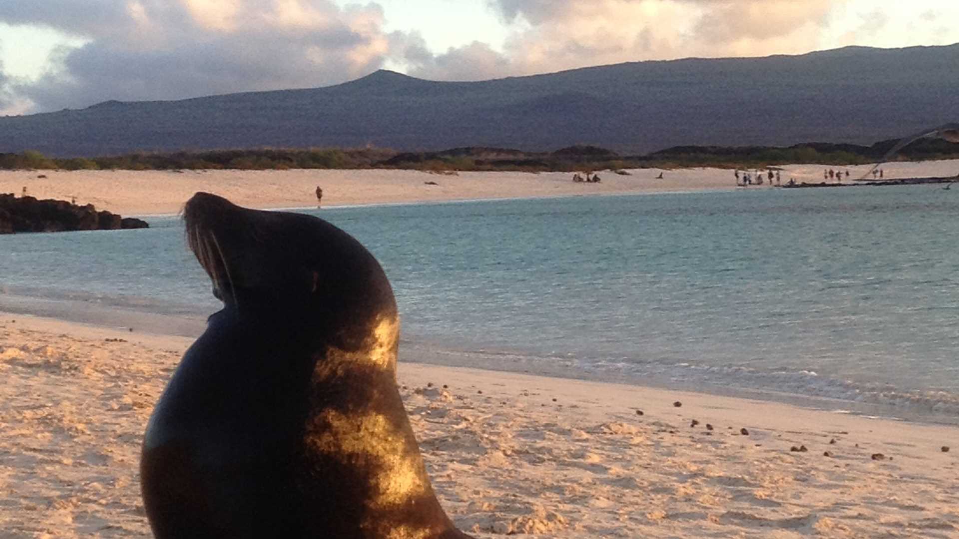 During lunch, we sailed towards a scenic shoreline, located at the western coast of San Cristobal Island, called Cerro Brujo, or Wizard Hill in English. This area of impressive geology features an eroded, towering tuff cone and a pristine white sand beach. When we landed at this remarkable site several groups of female Galàpagos sea lions were raising their young and each group had an alpha male patrolling in front of them. The sunset offered multiple opportunities for striking photocompositions as it was setting right next to an isolated outcrop called Leon Dormido or Kicker Rock in English.