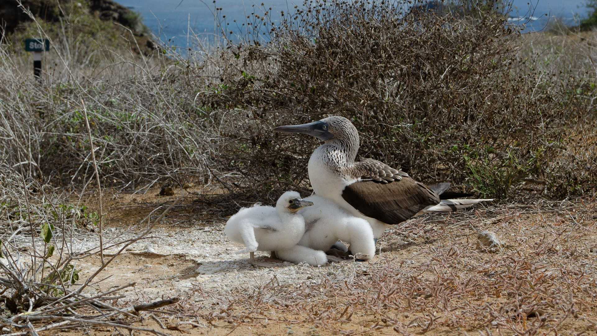The landscape at Punta Pitt is breathtaking. The tuff cones are huge and have been eroded in a completely different way from other cones—they look like spikes on the back of an old dragon.  As we walked up, we found various endemic lava lizards and a few finches, but nonetheless the highlight of the walk was to see several blue-footed booby pairs with chicks of all different sizes. Some were just a few weeks old, and some were bigger than their parents, but all of them looked very healthy. It is a relief to see that these beautiful birds are coming back to nest on this site.