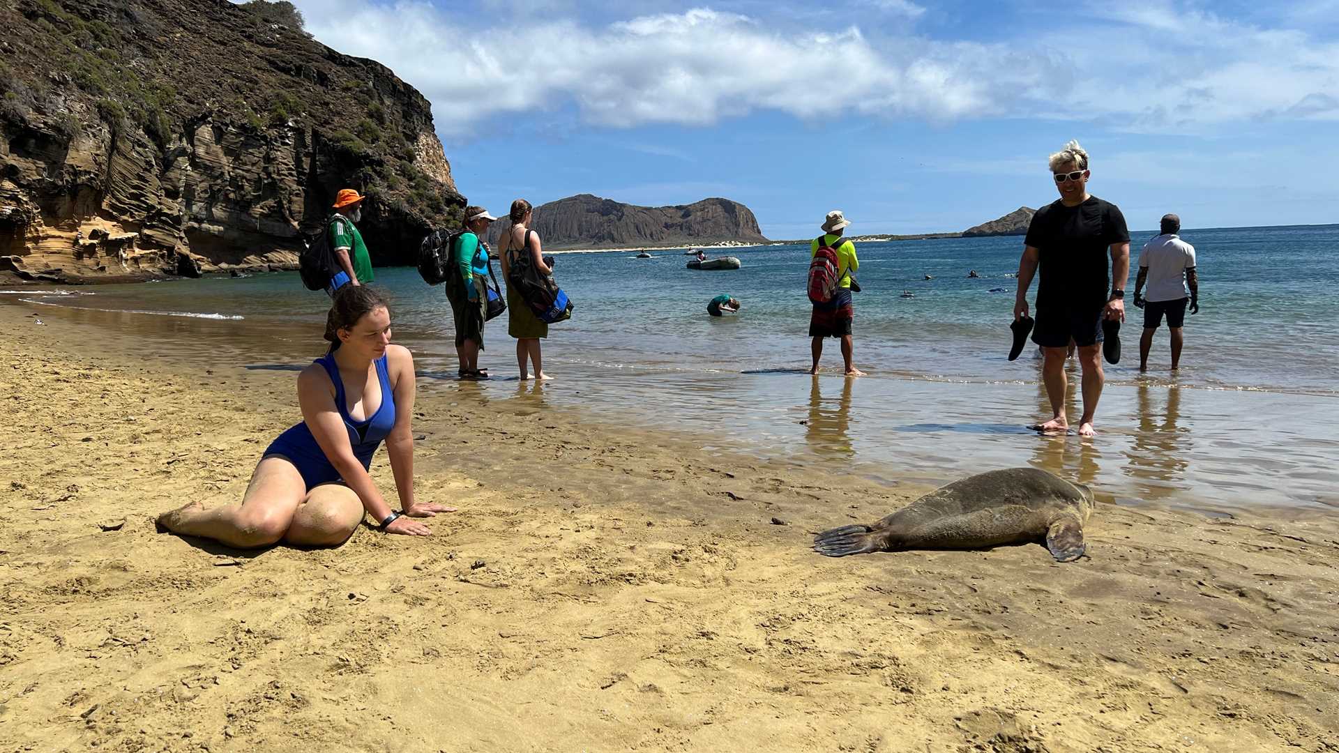 Punta Pitt is special regarding its topographic profile; it is distinct from other landscapes we observe in the archipelago. This site almost seems to resemble a landscape from the southwest United States. We observed several species endemic to San Cristóbal Island along the trail: the San Cristóbal mockingbird, the San Cristóbal lava lizard, and the San Cristóbal marine iguana subspecies. Guests were thrilled to interact with the Galapagos sea lions back at the beach. They are such playful creatures. As higher order marine mammals, they learn through play and social interaction. They are incredibly curious about us humans.