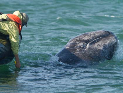 We spent all day getting close looks of these gray whales. Most of us had an experience that is quite unusual. The mothers and their calves found us and our inflatable boats interesting enough to approach us! Photographers were delighted to capture fantastic images of whale-human interaction, as others were having the life experience of touching a whale!