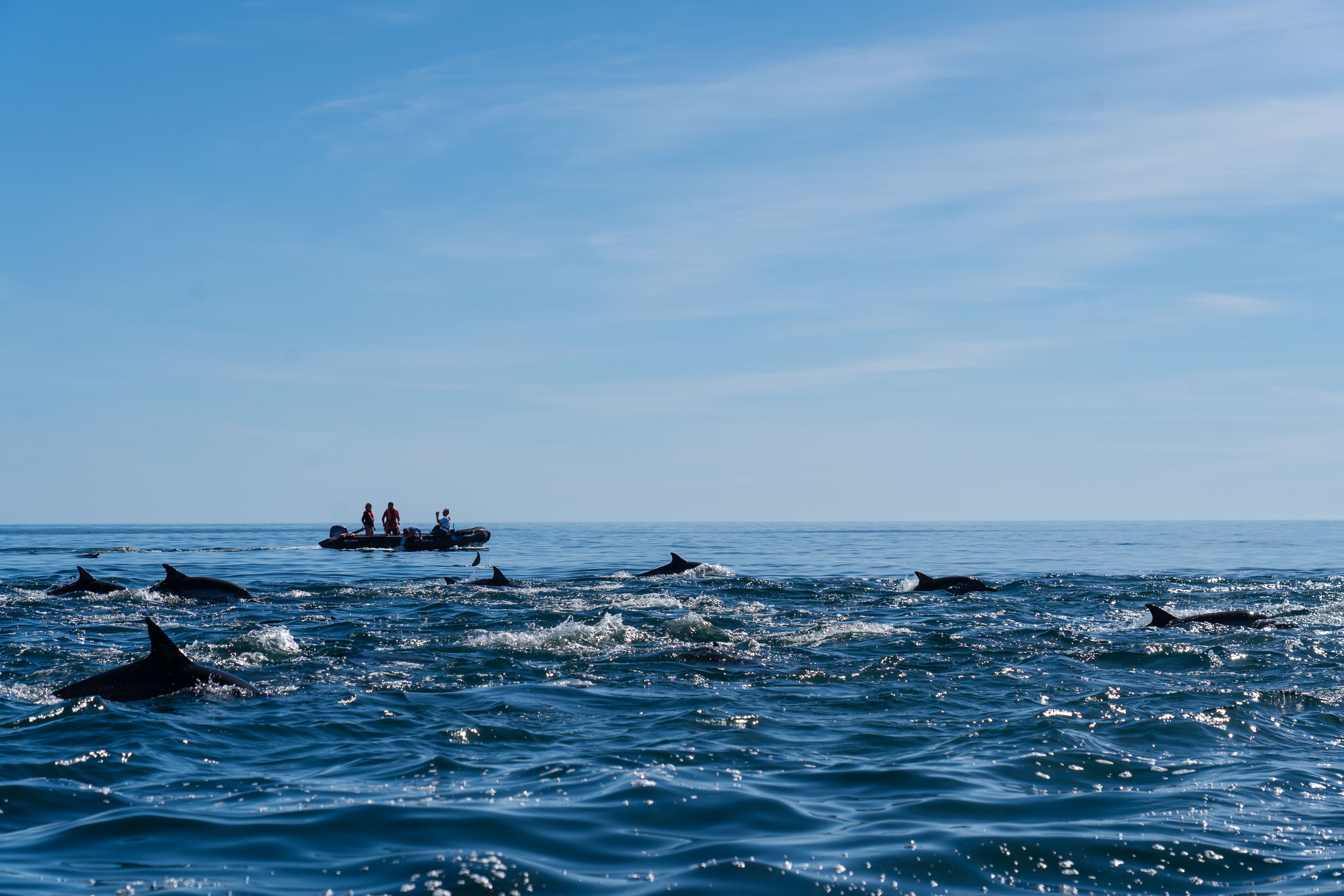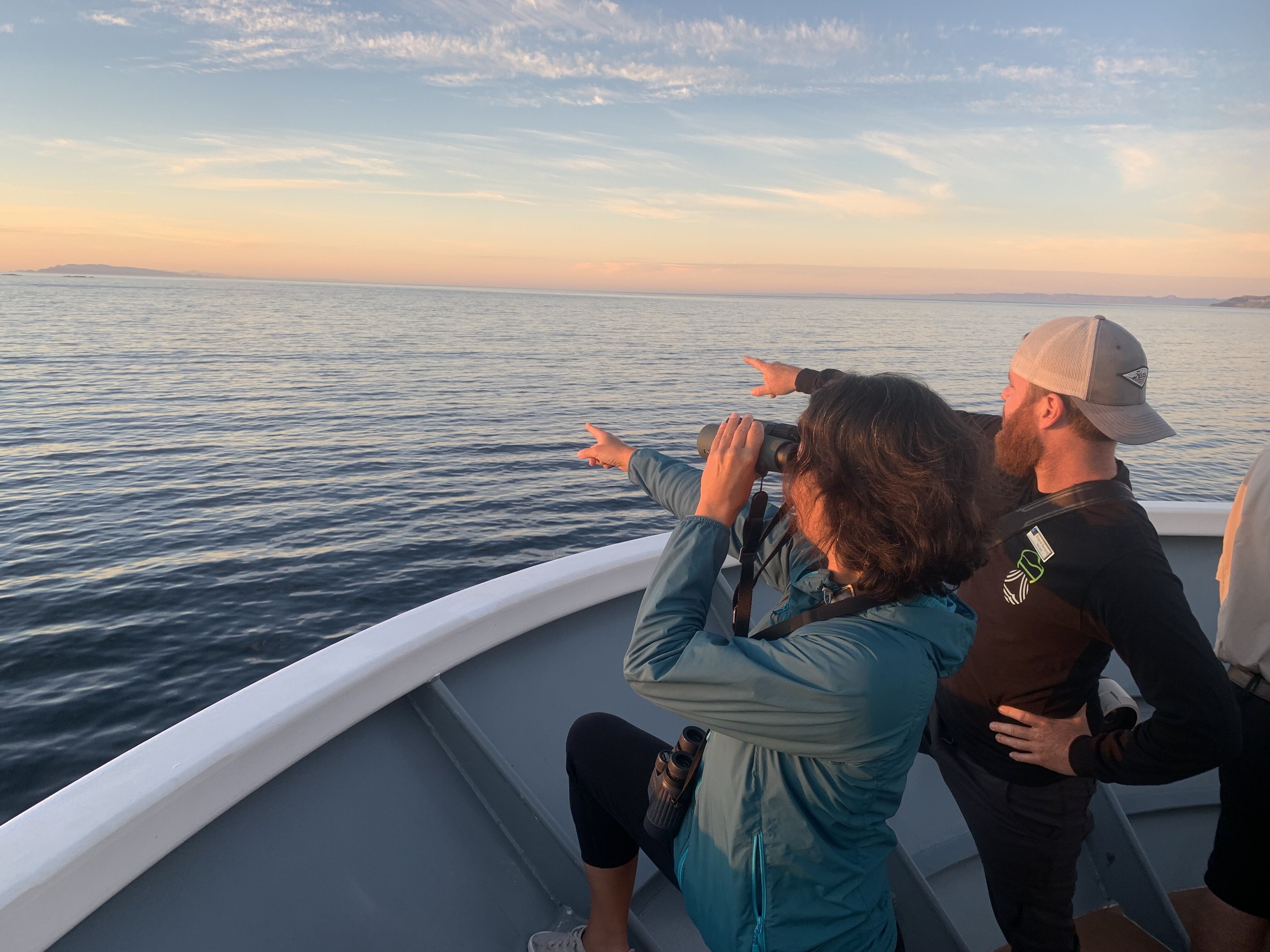 We started our day sailing the calm waters in the vicinity of San Marcos and Tortuga Islands; the light breeze and lack of clouds in the sky made a great combination for a very nice morning. We watched numerous flocks of phalaropes –small, sea-going migratory birds related to the sandpipers- sitting in the water or flying around, brown boobies plunging trying to capture fish and even the occasional pomarine jaeger or red-billed tropic bird. However, what really made our morning was a group of several fin whales! The second largest whale after the blue, the fin whale is also one of the most handsome, with whitish chevrons and dark blazes on its back and a white right lower jaw (the left one is all dark!). Although the species is found in all the world’s cold and temperate oceans, there is a resident population here of around one thousand individuals that never leaves the Sea of Cortez.