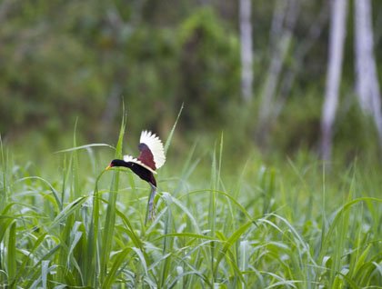 In the early morning we had a pre-breakfast outing along the riverbank. We boarded the skiffs and headed downstream, all of us with binoculars and cameras in hand, looking for some sort of wildlife. It did not take too many seconds to find that birds of all sizes surrounded us. There were some parrots, jacanas, flycatchers, and a toucan close to us! Shortly afterwards we realized that there were not only birds but there were several three-toed sloths. Some were still sleeping and others just starting their day. Certainly in slow motion!