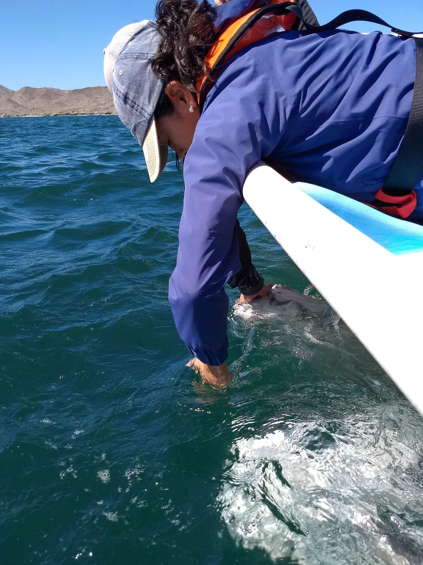 This morning, National Geographic Venture docked at the interesting port, San Carlos. From the 1940s to the 1990s, the port was used for loading agricultural products and fertilizers from the nearby Santo Domingo Valley. Nowadays, San Carlos is basically a place for loading sardines from a local cannery. It is also an important tourist base for whale-watching, principally mating gray whales. At the port, all guests and staff boarded buses to Lopez Mateos, a town located near the northernmost tip of Magdalena Island. The buses traveled across Magdalena Plain, a section of the Sonoran Desert that receives a lot of moisture in the form of dense fog from the Pacific Ocean. Lichens and orchillas, a type of flowering plant, give the desert a phantasmagoric appearance. Guests and staff enjoyed spotting numerous birds, including crested caracaras and kestrels. Once in Lopez Mateos, we boarded local pangas for whale-watching. During two rounds of whale-watching, we encountered several whales close to our pangas. However, most of the whales were preoccupied with traveling, searching for mates, or just finishing their time of reproduction and thus exiting the lagoon. In reality, the whales were not interested in interacting with the boats and their excited cargo, but we had many opportunities to observe the behavior of these magnificent animals. In town, we all delighted in a delicious fish lunch, ‘pescado zarandeado.’ We enjoyed exploring the local dock with its many colorful shops and crafts, and we admired the wonderful sculpture of a cow-calf pair of gray whales.