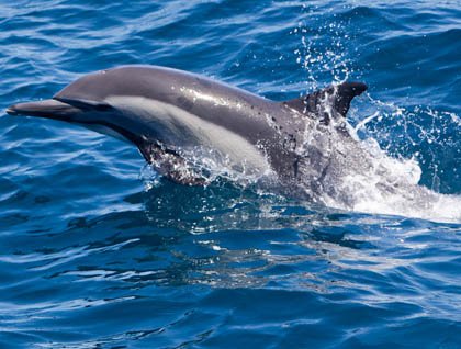 As we headed towards our afternoon destination, we came upon a massive feeding frenzy of birds and dolphins. At least one thousand common dolphins were scattered about and driving fish up towards the surface. When the fish, probably something like an anchovy, neared the surface, they were attacked from above by the birds. Boobies were diving from high, rocketing into the ocean leaving trails of bubbles behind. Terns and gulls joined in, creating quite an impressive sight. It continued on and on, in one of the largest congregation most of us had ever seen.