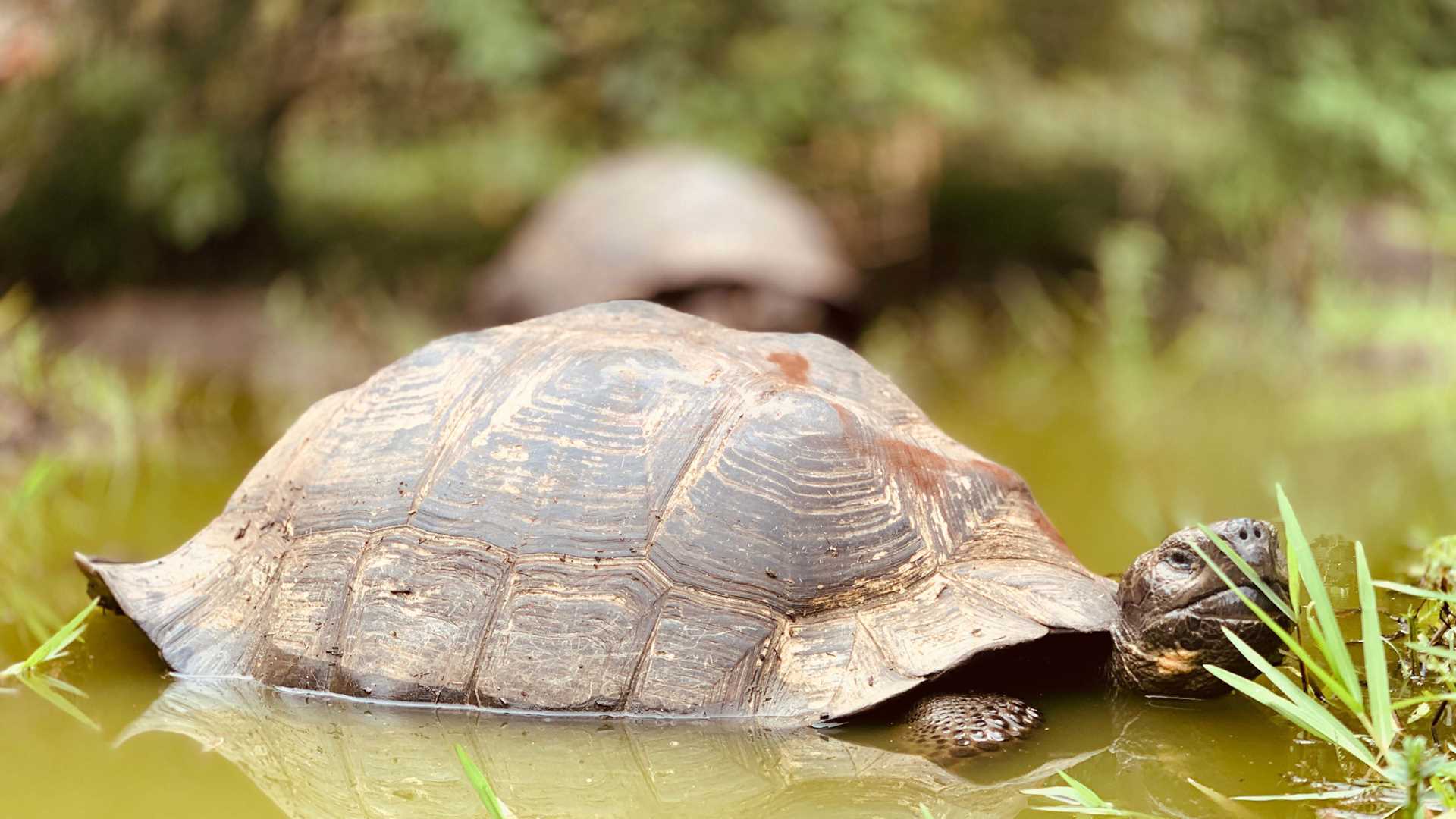 Photo caption: A Santa Cruz giant tortoise wades in a freshwater pond. Giant tortoises are ectothermic. They regulate their internal body temperature via external forces such as shade and sunlight. They utilize mud from the ponds to reduce the accumulation of parasites on their carapace. Photo by Alexandra Widman