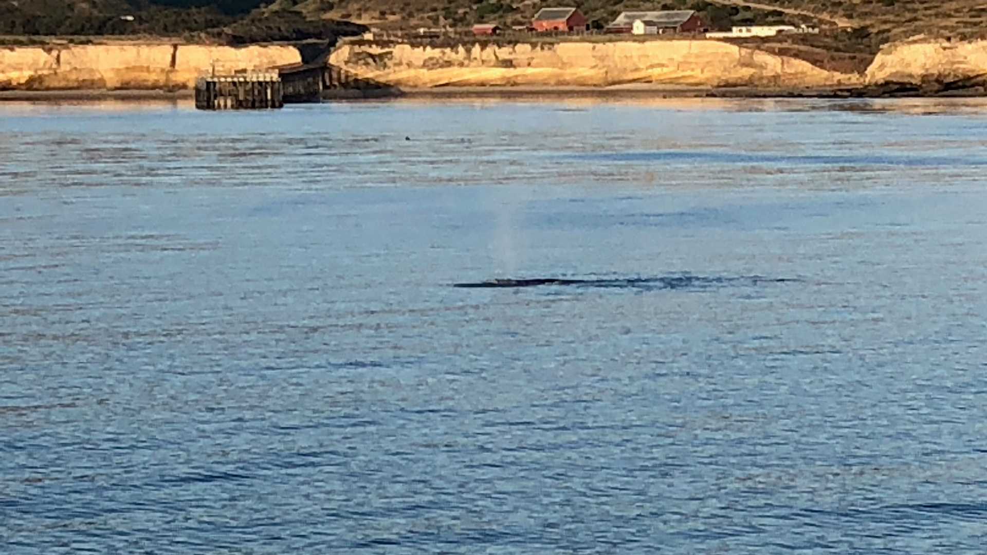 Happy National Park Week from aboard National Geographic Quest in the Channel Islands National Park. Tweet tweet…the ship’s morning larks were rewarded today. The clear horizon and calm state of the sea allowed us to see Santa Barbara Island to the south, quite a rare phenomenon. We could hear the barks of California sea lions from the shore, and squadrons of cormorants pursued schools of sardines outside the kelp beds. And the coup de grace… is that….yes it is… it’s…three gray whales, just 100 meters off the stern of National Geographic Quest! Two adults and one calf engaged in what appeared to be feeding behaviors in 37 feet of water. My oh my, how the calf has grown in the months since its birth in the lagoons of Central Baja–twenty feet plus is a rough estimate, compared to a length of approximately twelve feet at birth. A successful six thousand mile migration hinges on this kind of rapid growth and development.