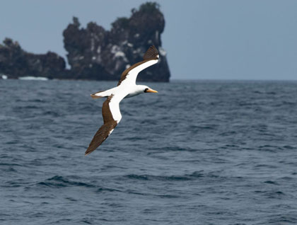 Later on after breakfast we headed to a new place for more adventures. We explored Buccaneer’s Cove from Zodiacs and kayaks. This outing was a great opportunity for bird watching, especially Nazca boobies and breeding pelicans.  Later on we explored the snorkeling site that offers a variety of fish and a unique landscape made of red cliffs and caves. Here there are a lot of tropical fish decorating the rocky reef as well as sea lions and nesting pelican on the rocks above the water.