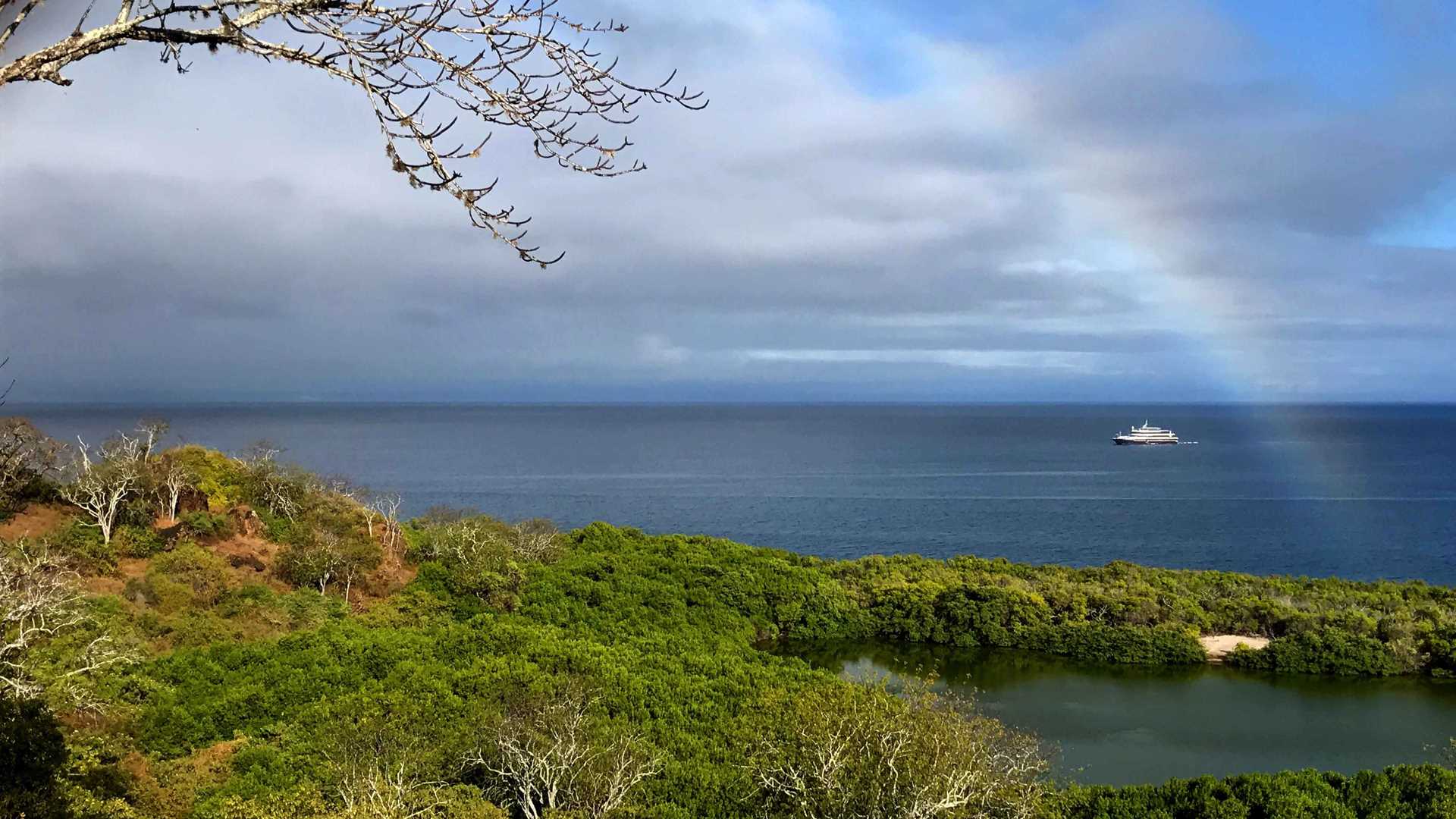 Yesterday we motored for few hours from the western part of the archipelago back again to the center Islands. We started our day on the western side of Santiago Island and after an early wake up call, we landed at Espumilla beach. It is a place covered with an interesting mix of volcanic ashes and tiny pieces of olivine crystals where we spotted tracks made by sea turtles and holes made by ghost crabs. After crossing a button Mangrove forest we walked through a dense vegetation tunnel made by branches and bark of Mangroves. Then we continued through an area covered by huge Palo Santos trees, the soil was a bit wet, giving a very enjoyable smell. Now is the cold, dry season in Galapagos, but still raining in some parts of the archipelago. The walk was fabulous and at the end, up in the sky, a single Galapagos hawk was marauding, and mocking birds were protecting their territory. Then on our way back to the beach we saw a beautiful rainbow on the clear horizon. It was a great finale for a unique morning walk.