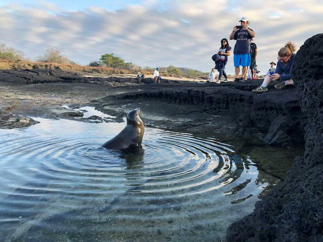 Soon after we were disembarking in Egas Port, where we had a unique black beach for ourselves to swim, relax, and snorkel. To end the outings of the day, we went for a walk around the shore and intertidal pools of Santiago with sittings of land, marine iguanas, sea lions, shore birds, and Galapagos fur seals.