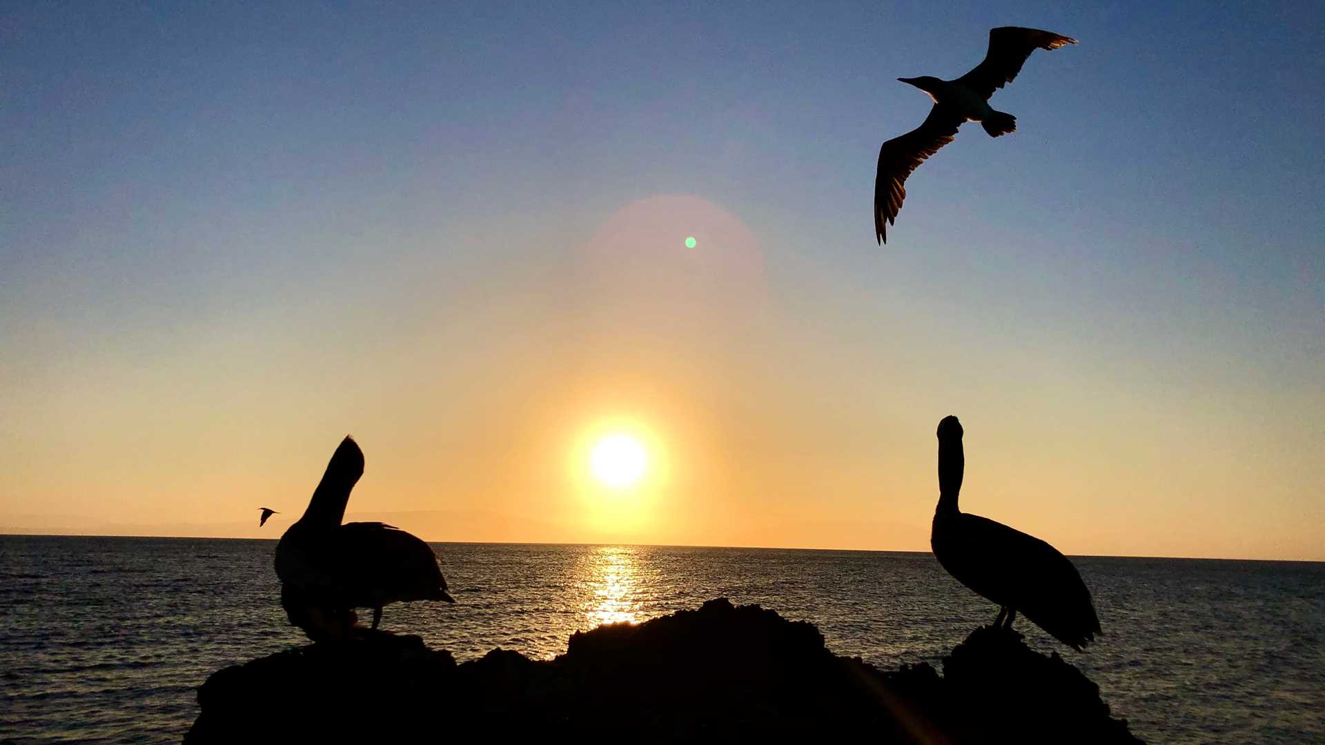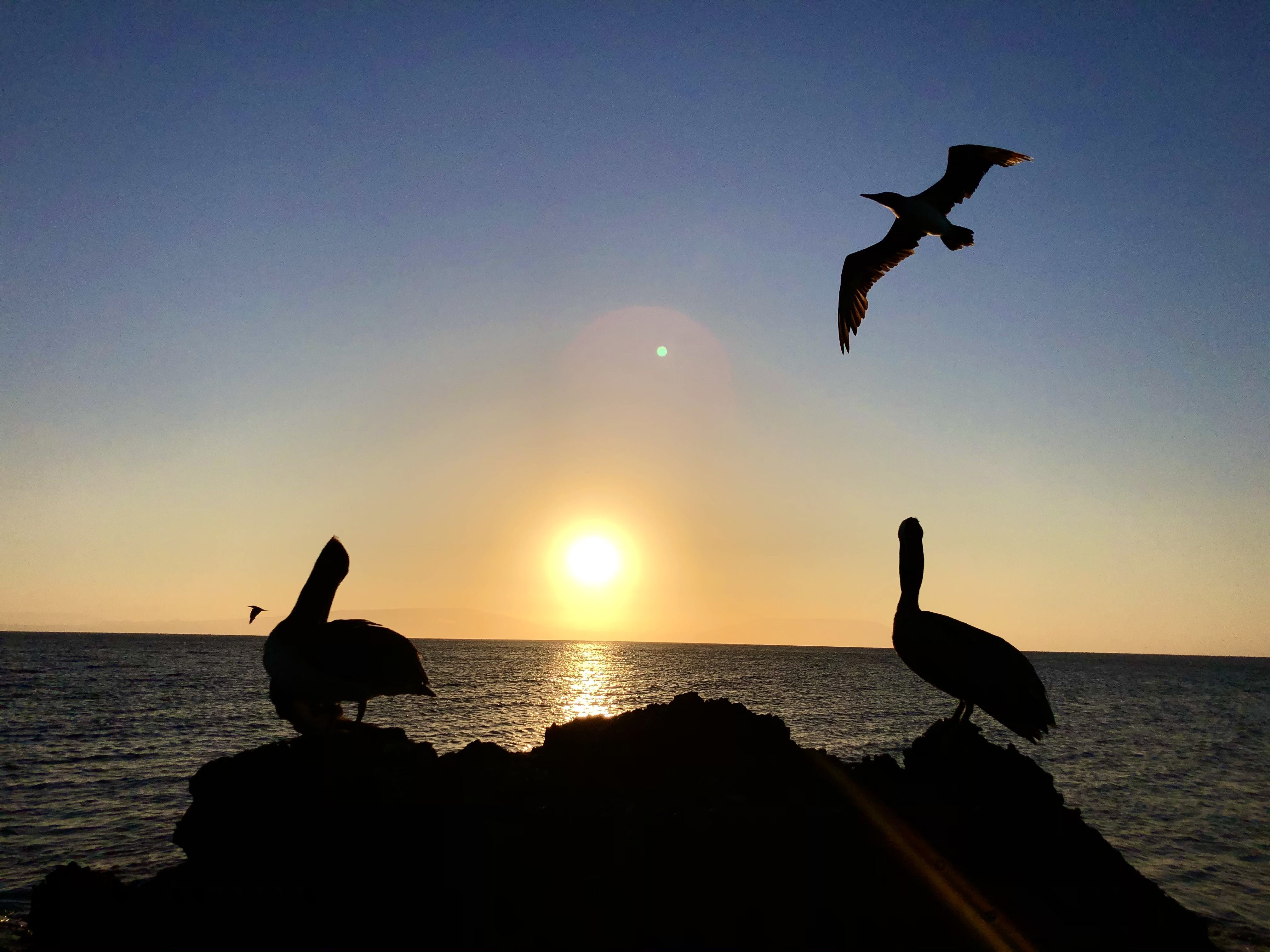 As soon we came back, we repositioned the ship to our next destination, Puerto Egas. Here we disembarked on a black sandy beach. Some of our guests decided to spend all afternoon swimming there with the playful Galapagos sea lions. They had a blast snorkeling along the shore, exploring the underwater world of Santiago Island. Late in the afternoon, we all went to explore inland.  We could spot different kinds of land birds among the branches of trees, singing and standing close to us with no fear. We did spot the yellow land iguana, wonderful to see since they once left the island due to introduced species, but were brought back in January 2019 by the Galapagos National Park Authority after more than 100 years.  We also walked along the coastal zone, where the landscape changed radically. There were spectacular tidal pools with marine iguanas, shorebirds like great blue heron, American oystercatchers, whimbrels and sanderlings. At the farthest point of the trail, we witnessed a colony of fur sea lions. After this beautiful day exploring Santiago Island, we have a perfect sunset light. We celebrated this amazing day with a BBQ at the sky deck! It was another wonderful day in paradise aboard National Geographic Endeavour II.