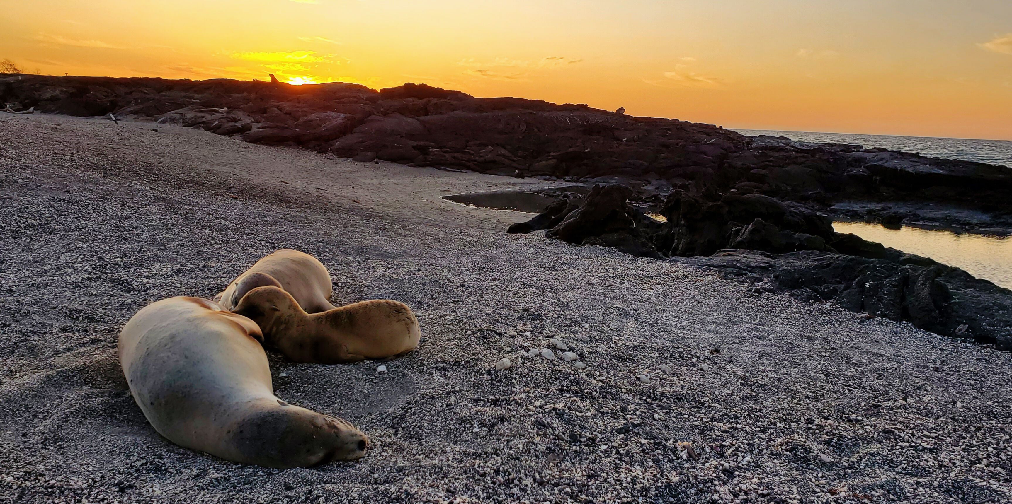 On National Geographic Endeavour II today, we explored Bartolome, home of a small colony of Galapagos penguins. Bartolome is one of the youngest islands, and it is located next to Santiago Island in the central part of the archipelago. After an amazing sunrise, we went ashore for a walk, and we were transported back to a time when the land was newly formed. We began our day by hiking to the top of a tuff cone known as the islet of Bartolome, named after the First Officer of The Beagle . Walking on this young island allowed us to understand the formation and volcanism of the Galapagos Islands. The rocks are a great way to understand the area and its geology. We spotted a few lava lizards and painted locusts, some of the very few animals on this island. As we reached the top, we had a great view. Our guests enjoyed the magnificence of Pinnacle Rock. After we visited one of the most iconic geological formations of the Galapagos, our breakfast was enhanced by dramatic views of the impressive volcanic landscape. We visited the beach near Pinnacle Rock, where we enjoyed how the sun made the sand sparkle due to a concentration of silica. Later, we went snorkeling along the channel between Santiago and Bartolome Islands. Many of our guests spotted whitetip reef sharks and very colorful parrotfish. The landscape was beautiful with lots of sea stars. We enjoyed the chance to be surrounded by Galapagos penguins and feel accepted as part of this environment. After a delicious Mexican lunch, we had lectures on the photography of reptiles and Darwin. Afterwards, we went to Chinese Hat Islet to snorkel from the Zodiacs. The area is home to a small colony of Galapagos penguins. In a sandy-bottomed, sheltered channel, our guests enjoyed swimming with whitetip reef sharks, rays, and many fish. It was a nice and sunny afternoon. After snorkeling, we had the chance to explore the unique, small volcano that formed an island in front of Santiago on a sunset Zodiac ride. After a spectacular day full of activities in the field, we returned on board. Every day in the Galapagos is an opportunity to reconnect with the beauty of nature through unbelievable encounters!