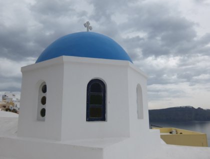 In Oia, the clouds this morning provided a rare opportunity to photograph the town’s iconic blue domes and white houses in gently filtered sunlight. After our leisurely morning stroll in Oia, we headed to the village of Pyrgos for a lunch of mezedes and the world-renowned Santorini wine. The selection of mezedes—all of which featured locally-sourced produce—was overwhelming: smoked white eggplant, savory tomato croquettes, puréed fava beans, and a casserole of rustic Greek cheeses. The meal was finished off with a delightful orange cake and strong coffee before an afternoon exploring the island’s archaeological gems: the Museum of Prehistoric Thera, with furniture, frescoes, pottery, and other objects from the island’s distant past, and the archaeological site of Akrotiri, where ongoing work continues to illuminate the splendor and sophistication of this unique Bronze Age settlement.