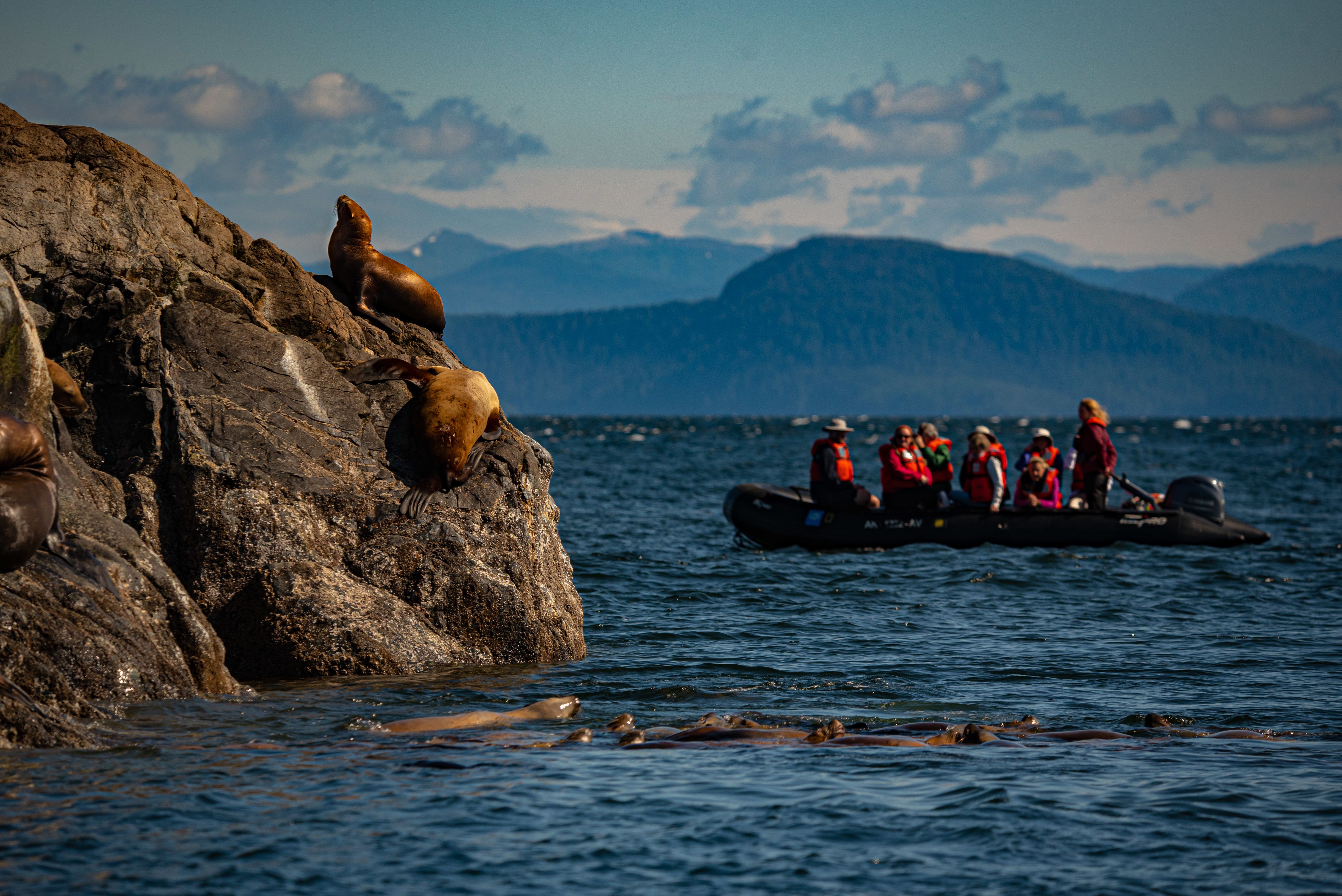 When a muted sun rises over the mountains, we begin scanning for wildlife and find a handful of humpback whales leisurely feeding and napping alongside the boat. A few of these gentle giant leviathans flash their broad flukes, making shallow dives in search of breakfast, while others rest, “logging” alongside the boat, sleeping one half of their brains at a time, shallow breaths made apparent by weak spouts. Following the lazy humpbacks, our excitement is piqued by a pod of orcas. They are spread across the water, two here, three there, a loner near the far shore. When one of the males erupts from the water into an excited, twisting breach, we race to that side of the boat to see another and another aerial display.