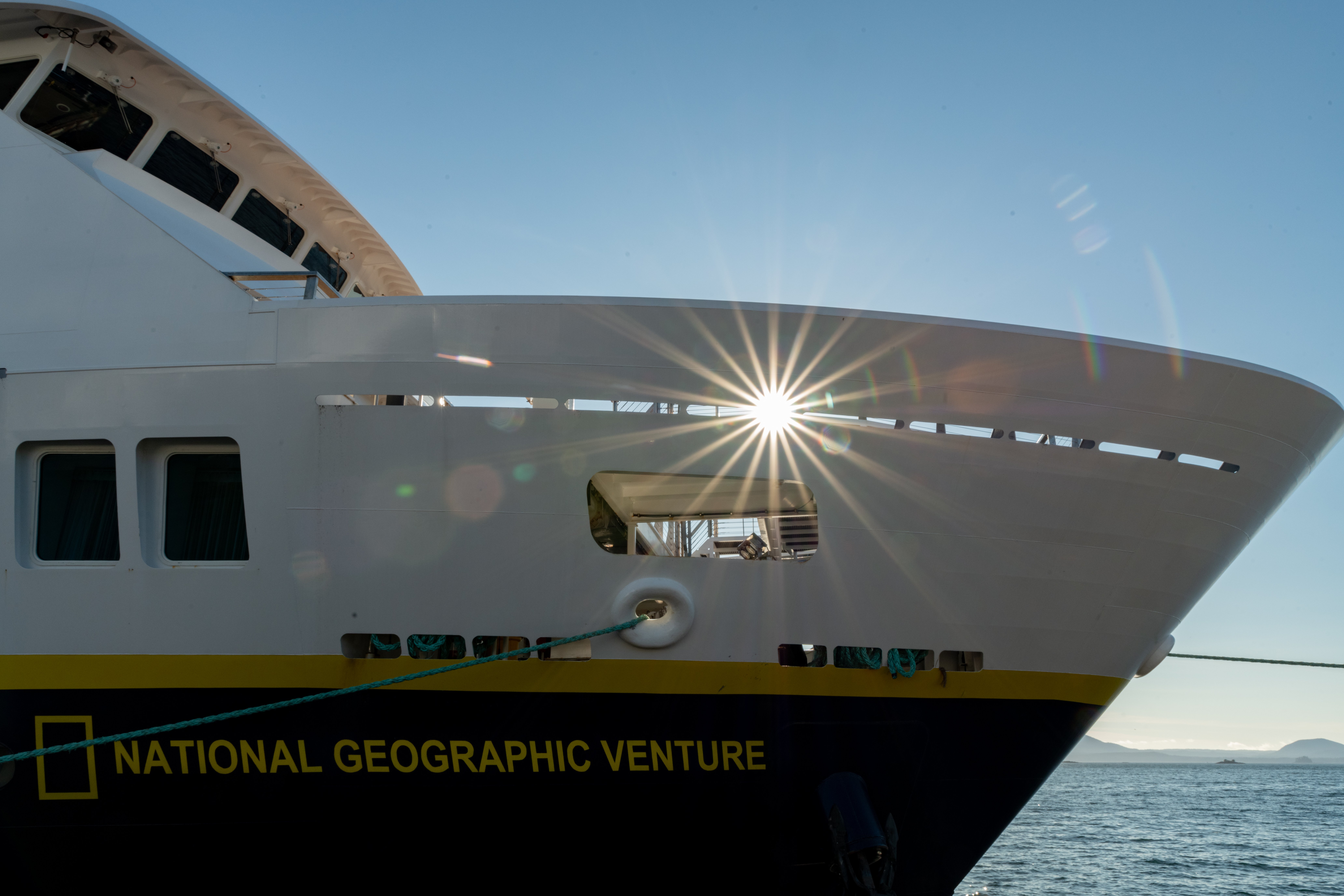 To stand on the bow of the National Geographic Venture when the foghorn blows is to be shocked. It doesn’t matter how many times you have already heard it. It doesn’t matter how you try to prepare yourself, or to stay calm. It doesn’t help that you know it is coming. I think for a moment I might capture with my camera the reactions to these soul-penetrating blasts on the faces of guests and staff, but by the time I get over my own reaction to each thundering roar, and my shock turns to laughter. The rest of the early risers are also beyond their shock and chuckling with me.