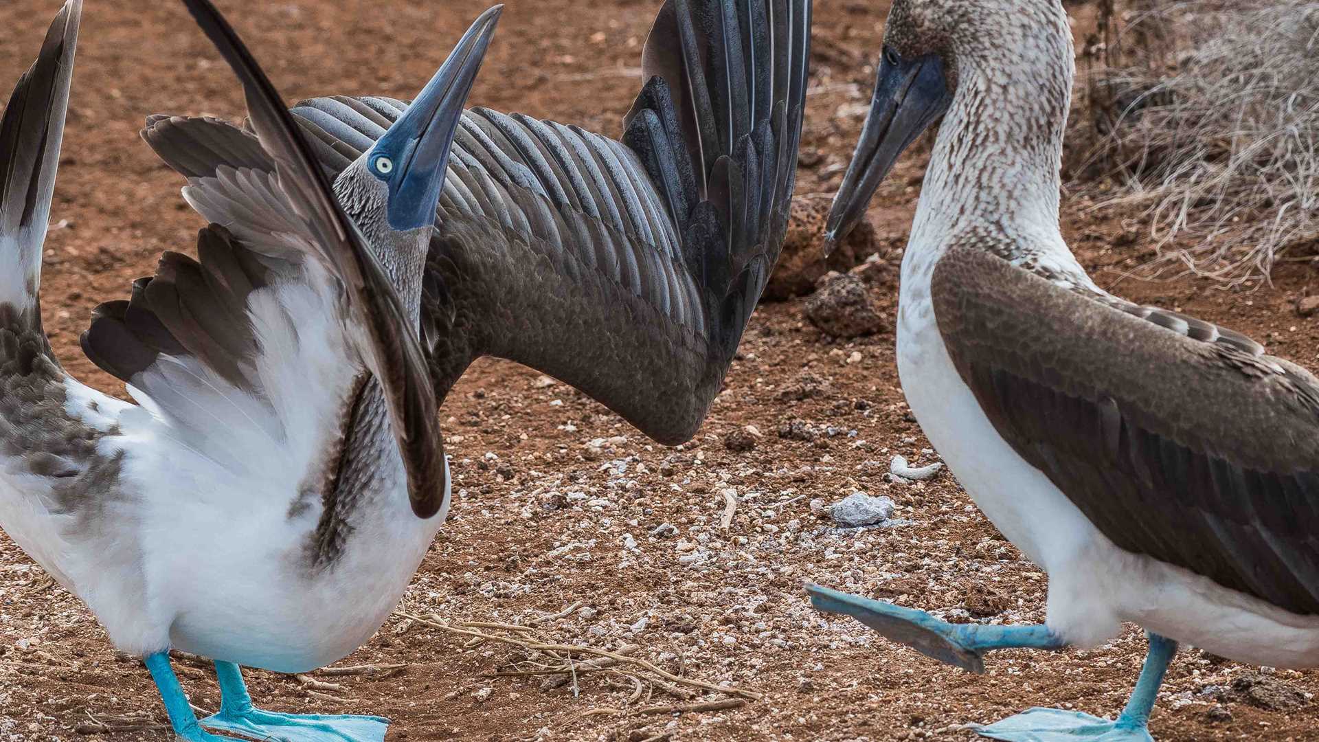 Today is our first full day in the Galapagos archipelago, the magic of which revealed itself early on our first outing at North Seymour. Just less than two square kilometers, this land is one of the most critical nesting sites for blue-footed boobies, and both the magnificent and great frigate birds. A few feet into the walk, we found a swallow-tailed gull with a very young chick. Further along we found a few male frigate birds with pouches full and ablaze, each making different sounds and flapping their wings as the females flew above.