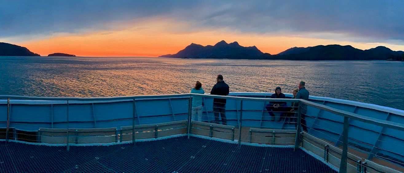 Clearing skies and the wash of sunset from the west painted our departure from Sitka on Saturday evening. The hustle and bustle of our inception aboard National Geographic Quest settled as we headed into the narrow island passes of Southeast Alaska, where we finally turned in for the night. The changing weather brought on surprisingly strong winds and brilliant blue skies as we woke up transiting Sergius Narrows into Peril Strait. The land and seascape unfolded under bright sunshine, and many enjoyed the morning downwind run towards Chatham Strait on the outside decks.
