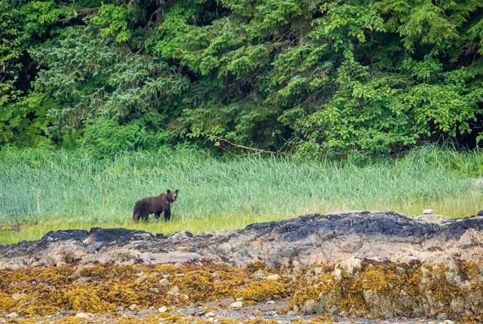 This morning, we awoke to another warm sunny day in Southeast Alaska. In the meadow at the end of Sitkoh Bay, brown bears lumbered through the thick sedges. The glassy water reflected the blue sky. A steep, rough-rocked beach served as our staging area for the morning – a place where we could meet for our morning activities. An old logging road provided the perfect path for our walking explorations. Tall red alders lined the sides of the road forming a lime green leaf canopy. Salmon berry and thimble berry bushes filled the understory. In some places, the cow parsnip and other vegetation around the salmon berry bushes was trampled - the berries were gone, foraged on by bears. Further evidence of bears in the area was scattered along the road, in the form of large piles of bear scat. Inspection of the bear scat indicated, in addition to eating berries, the bears had been eating sedges. Unlike banana slugs we have seen on other walks during our trip, many of the banana slugs on this walk were white and incredibly numerous. Although the road was a relatively flat, consistent surface, care had to be taken to avoid stepping on banana slugs or in bear scat.