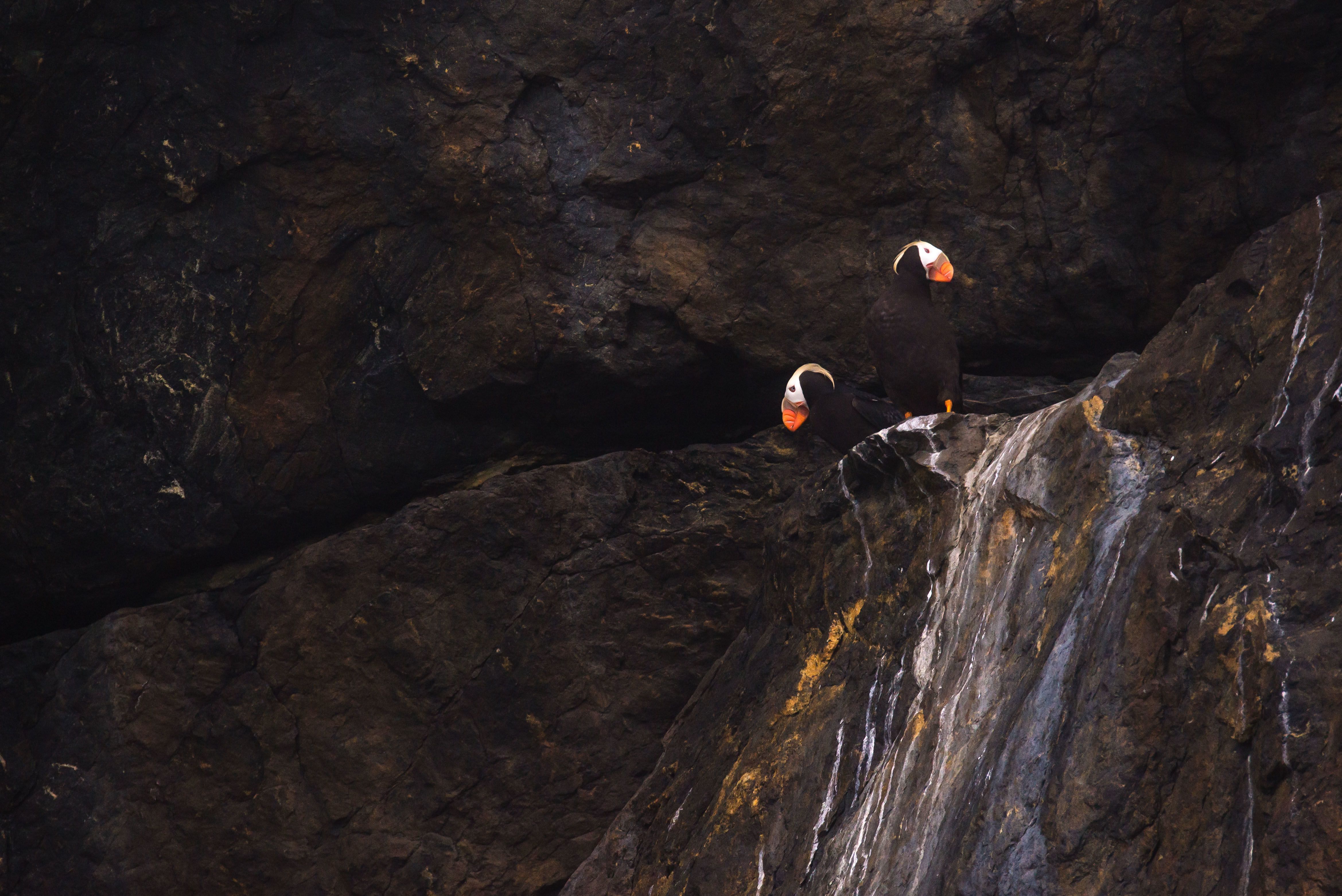 Our afternoon and evening were filled with marine mammals. A presentation by naturalist Steve Zeff started us off. Then, one fluke, two flukes…seven flukes were raised and gracefully disappeared – seven humpback whales within feet of one another. All of the sudden, after a couple of minutes underwater, all seven humpback whales surfaced, mouths open, filled with herring and sea water. The bubble-net feeding humpback whales continued their pattern of diving and surfacing, working their way north in Chatham Strait, along the shore of Admiralty Island. As the shoreline changed, the consistency of bubble-net feeding diminished and we resumed our exploration of Chatham Strait. Later in the day, a couple of Dall’s porpoises, incredibly fast swimming, small marine mammals, approached the ship to ride the bow and wake waves. To round out our day, naturalist Adam Maire told us about the fur trade in Alaska.