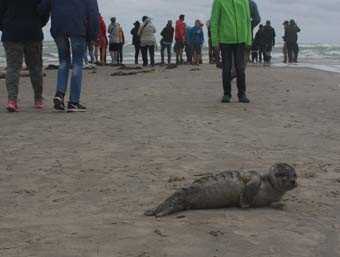 We divided into groups and explored in a variety of ways.  Skagen was admired for its unusual light, and a group of impressionist artists worked here.  Some went off to see a museum hosing their work.  Many went off the region’s largest dune.  It is more than a hundred feet high and is so expansive that one has little notion of its crescent shape.  We climbed this dune and some of its lesser neighbors.  Abstract patterns were all around us – sand like drifts of snow, sand blowing like fog, sand layers forming “topographic maps.”  But the overwhelming experience was the wind.  Wind, wind, wind!  Wind hissing in the grass and wind howling in our ears.  Others walked the coast, seeing three lighthouses that were built over three hundred years as the peninsula gradually lengthened.  These groups joined at the very tip of Denmark.  Here, its seas, the Kattegat and the Skagarat meet in turmoil.  Terns hunkered in the sand, and plovers scurried to and fro.  But all were pleased with the seals.  Two harbor seal pups lay hauled out in the sand.  Scores of people surrounded them, making a rather odd wildlife-viewing experience, but the seals didn’t seem to mind.  It’s quite normal for seals to leave their pups resting in the sand while they fish, and as long as the pups are not too much disturbed, this situation presents no problems.  Some went off to the bunker museum, entering one of the many massive concrete bunkers that the Germans built here in World War II.