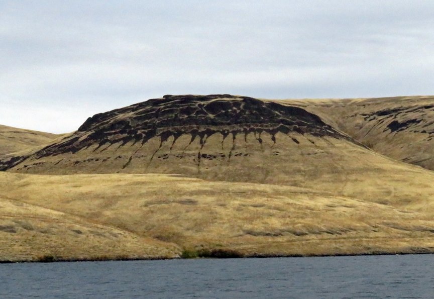 We passed Monumental Rock, called “Ship Rock” by Lewis and Clark when they passed here on their way west in 1805. Across the river from this great rock is an outcrop of basaltic lava where the entablature, the highly fractured top of a thick lava flow, has weathered into the most interesting pattern (see photo above). Then it was lunchtime and on to the Palouse River, a tributary of the Snake.
