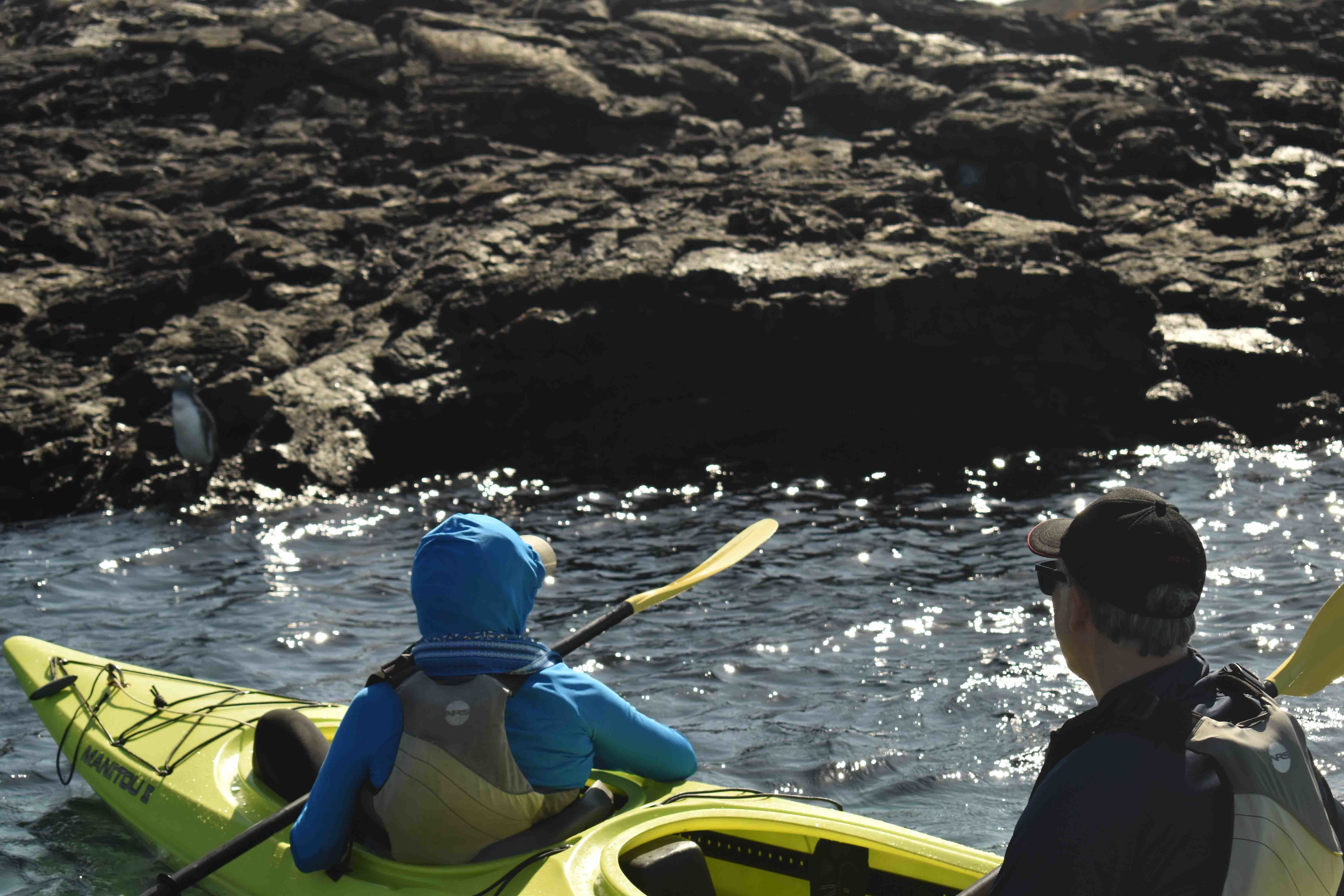 At 7:30 a.m., we had breakfast and we were able to see from the windows of the dining room black lava and turquoise water. After breakfast, we went on a Zodiac ride in search search of the Galapagos penguin and other creatures, plus the amazing landscape the island and nature offer to us. While some guests were off in Zodiacs, one group was kayaking and paddleboarding around this beautiful volcanic locale. Later we all went snorkeling in the amazing crystalline waters off Sombrero Chino.