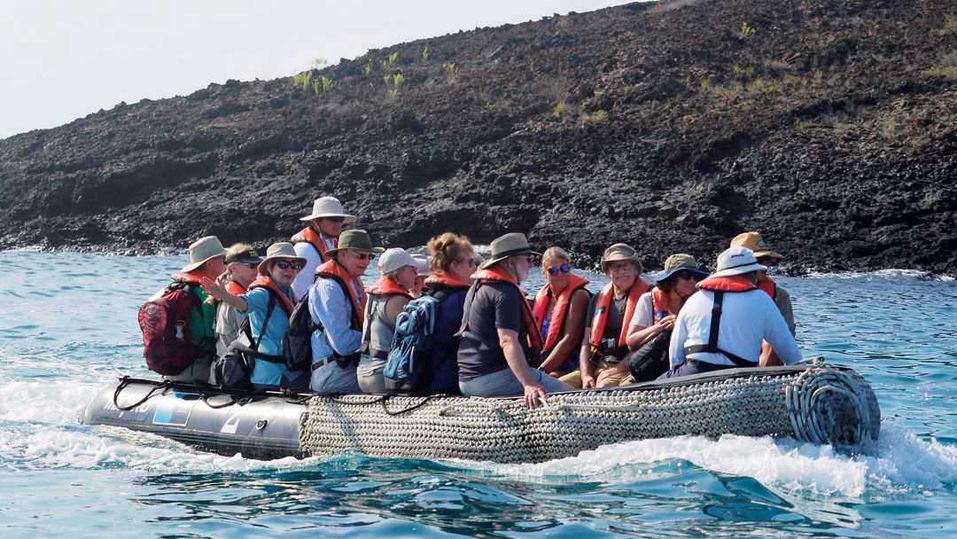 Back on board, we had lunch as we traveled to our next destination. Soon after lunch, we were given a talk about Charles Darwin, a young naturalist who visited the Galapagos in 1835, and changed the world forever! We anchored, and soon after a Zodiac ride took us to Sullivan Bay at James Island. Here, we had a one-and-a-half-mile long hike over lava flows, frozen in time as liquid rock solidified long ago. Another Zodiac took us to a nearby beach where we snorkeled and rested either on a towel or right on the soft white sandy beach.